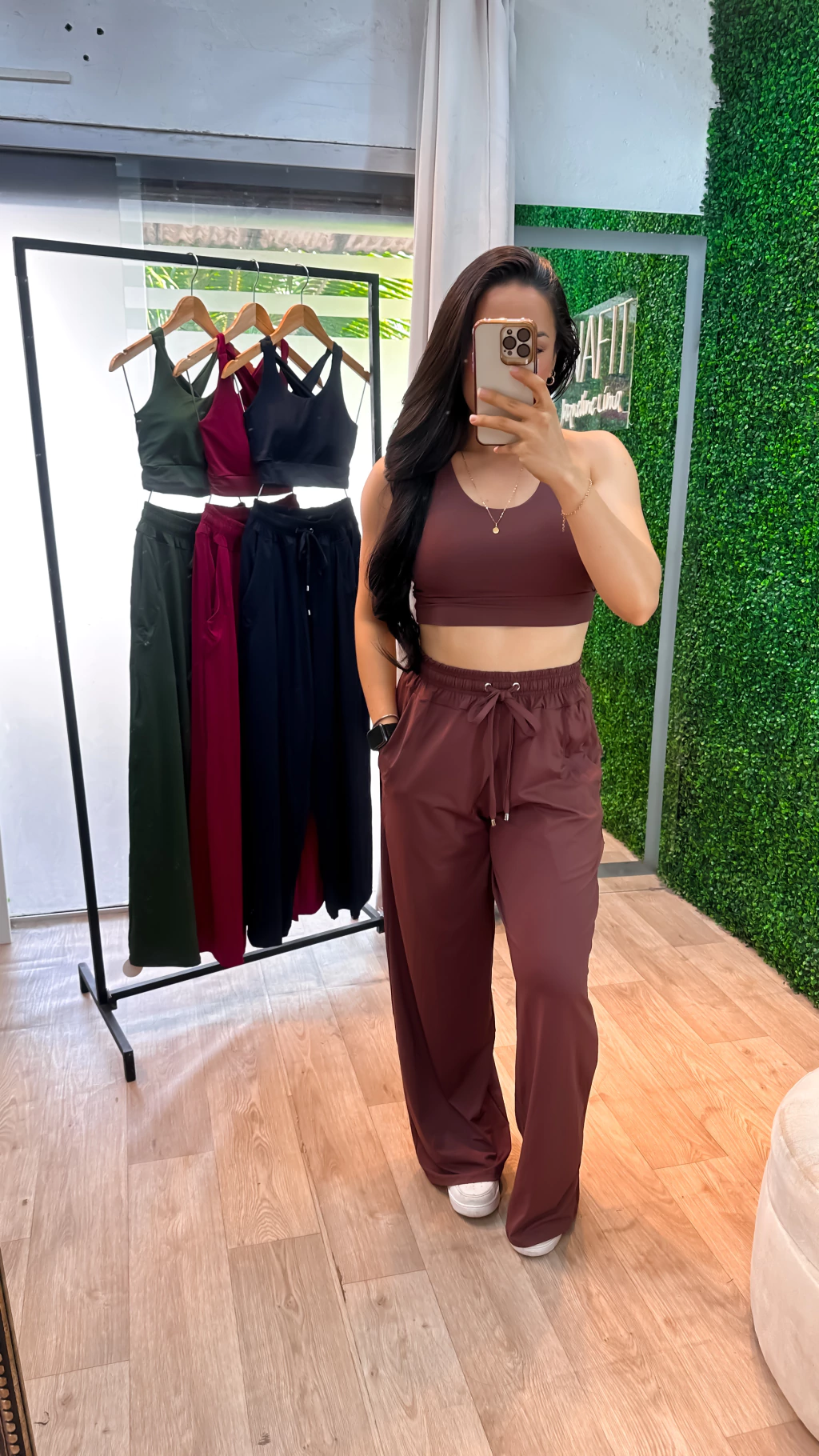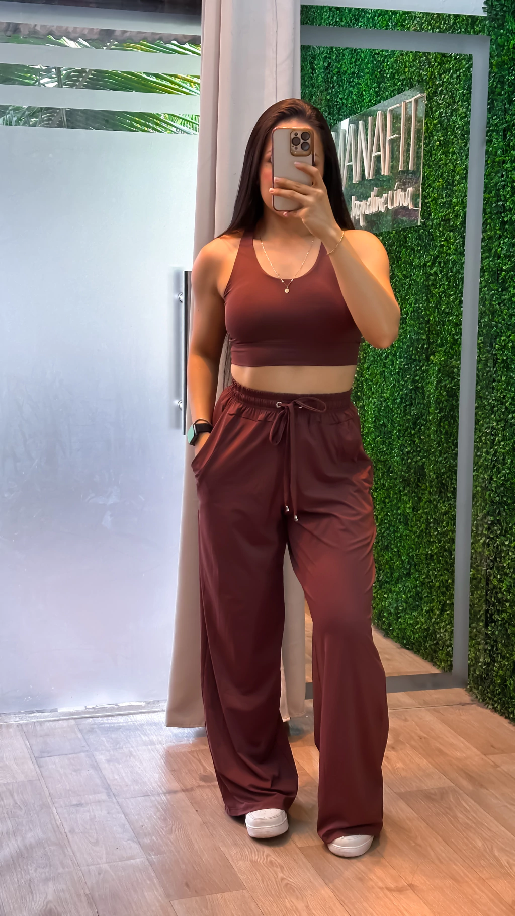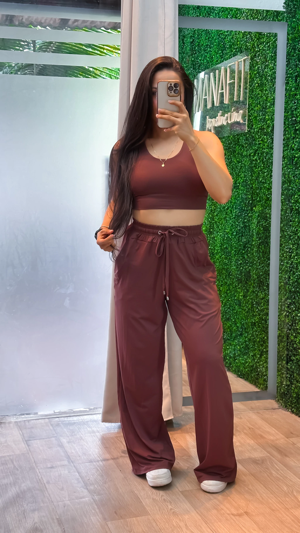 •Calça: cós alto em V transpassado, sem empina, acabamento bicolor