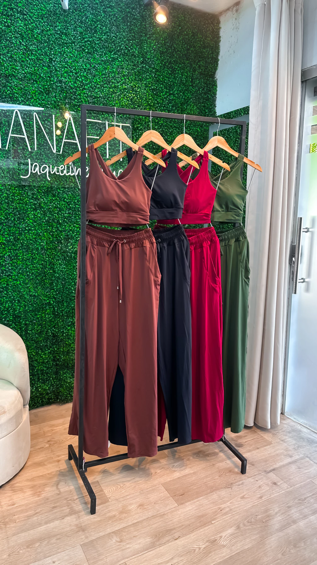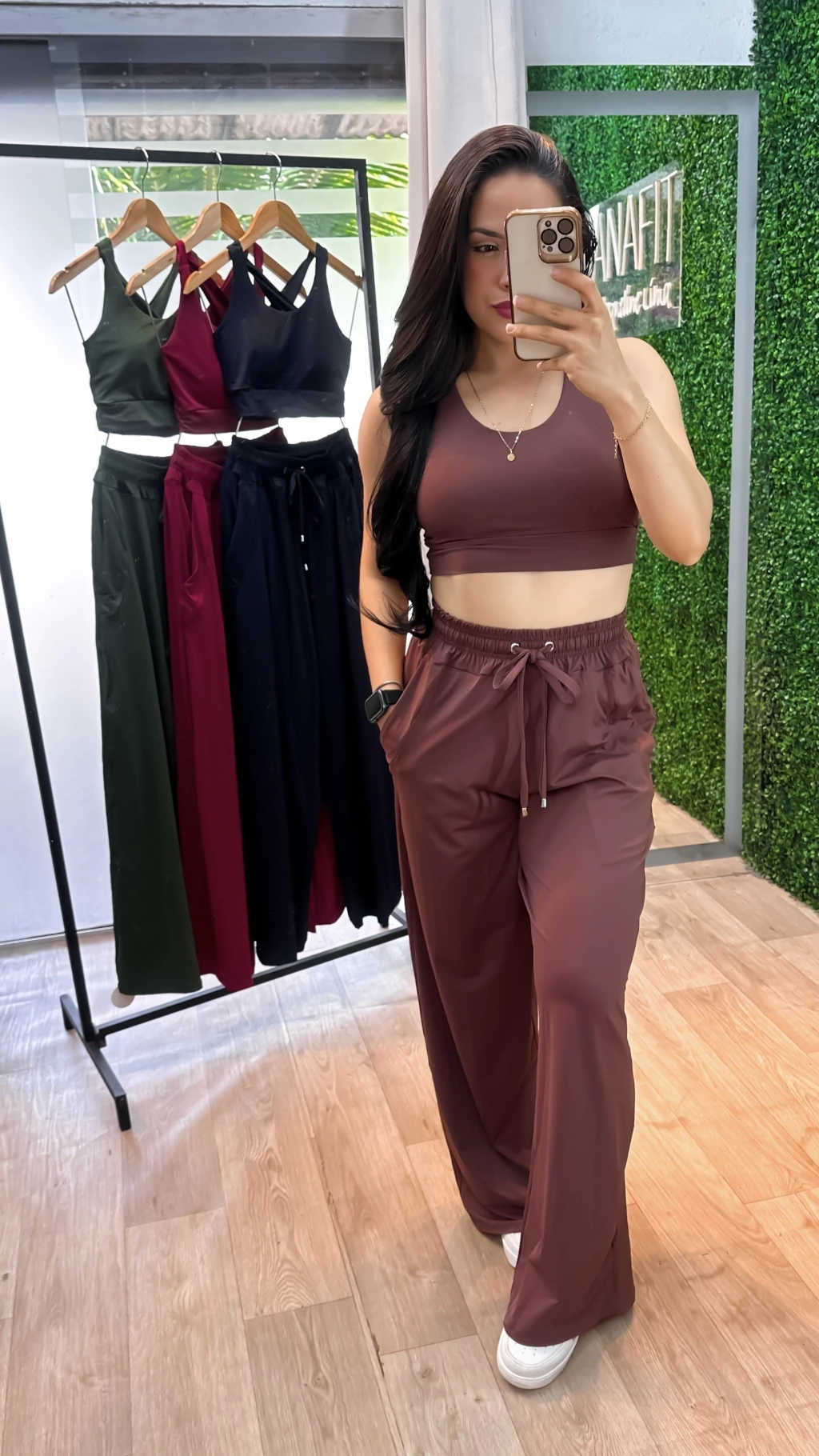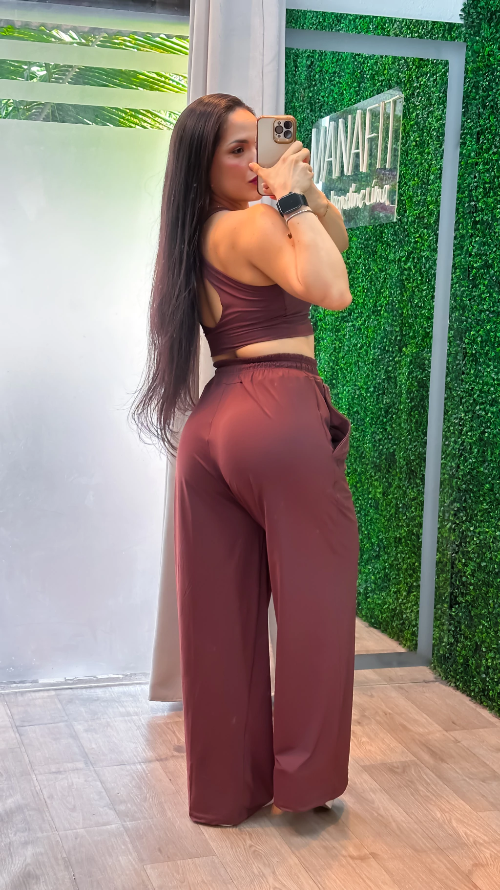 •Calça: cós alto em V transpassado, sem empina, acabamento bicolor